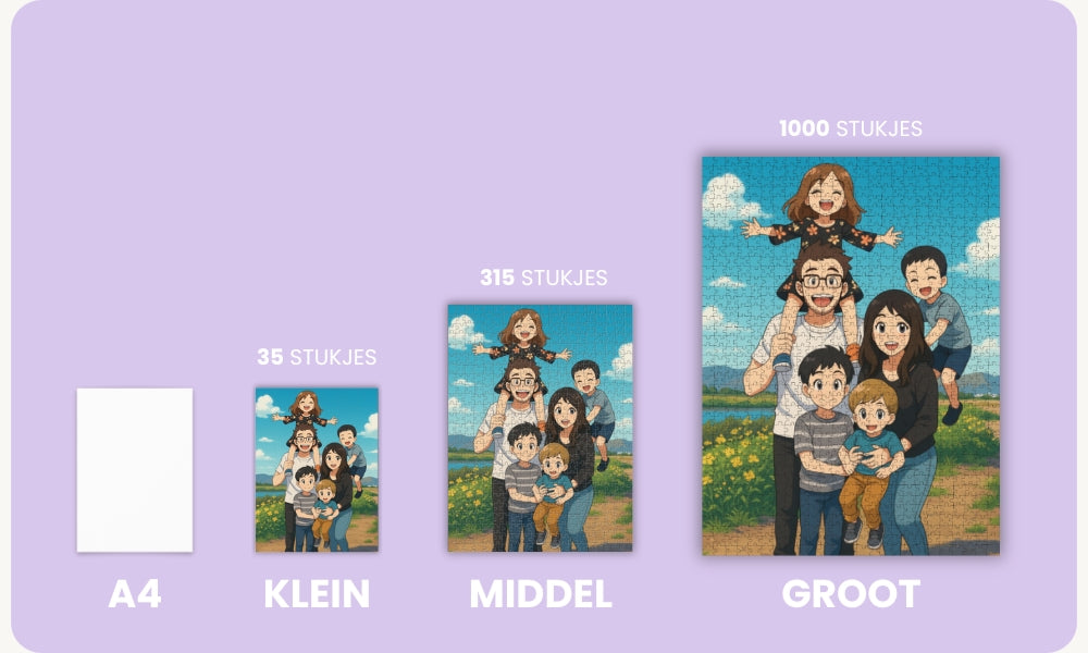 Voor elk moment een formaat. Knus of groots, snel klaar of uren puzzelplezier — kies wat bij jou past en laat het verhaal tot leven komen. En met een bijbehorende puuzl lijst zorg je er voor dat deze meteen een plekje aan de muur krijgt.